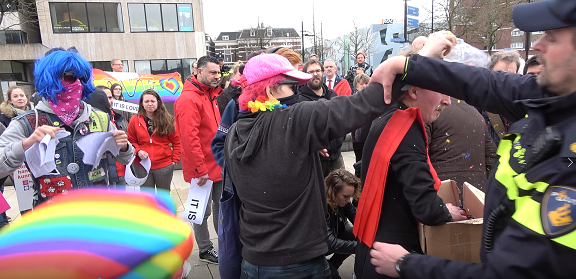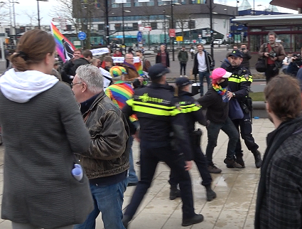 Zodra onze demonstratie begon kwamen zo’n 150 linkse Antifa-demonstranten, LHBT activisten en linkse politici onder politiebegeleiding aanlopen, deels met sjaals voor de gezichten. Het was direct duidelijk dat ze niets goeds in de zin hadden, maar van plan waren ons te verjagen, desnoods met geweld. De LHBT-activisten spuugden naar ons, trokken de flyers uit onze handen, verscheurden onze flyers, vernielden onze rozenkransen en maakten obscene gebaren en bewegingen naar ons. De politie had de handen vol aan deze LHBT-activisten. Een tweede bewijs van de toenemende onvrijheid in Nederland, wanneer je je mening geeft in het publiek domein en het gezin verdedigd wordt je aangevallen, bespot en uitgescholden. We zullen dan ook aangifte doen bij de politie wegens geweldpleging, vernieling en bedreiging. Dit agressieve gedrag mag niet ongestraft blijven. Het is vooral schandalig dat lokale politici meededen met de agressieve meute, denk hieraan als u gaat stemmen tijdens de gemeenteraardsverkiezingen.