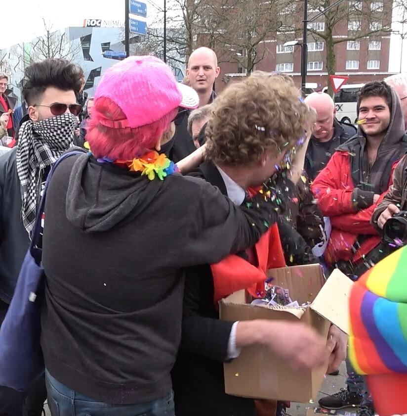Lokale politici van PvdA, VVD, GroenLinks en D66 waren aanwezig. Een krant was er ook en tekende op: “Omdat wij allemaal een Nijmegen willen waar iedereen zichzelf kan zijn”, licht de D66’er toe. Achter haar rug worden mensen met een andere overtuiging doodgewenst.”